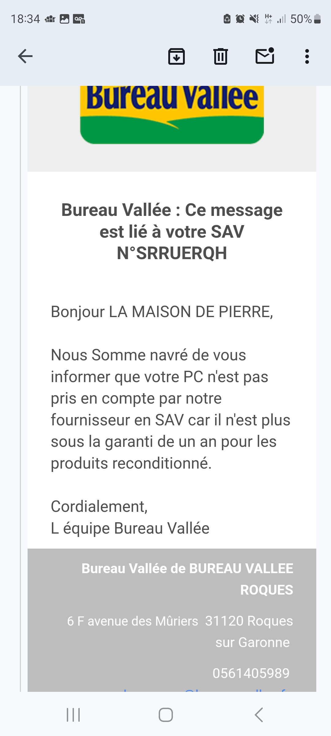 Posté le 23/09/2023 à 15:14"Si je devais noter l'amabilité des personnes au téléphone, ma note serait bien meilleure ! Mais d'un point de vue service c'est très très décevant. Cela fait 3 semaines que j'ai passé une commande chez eux pour leur acheter un répertoire. On m'a annoncé une estimation d'arrivée entre 7 et 10 jours, mais quoi qu'il en soit je devais être prévenu par texto. Au bout de 3 semaines, j'ai réussi à les avoir 4 fois au téléphone, pour deux fois où la personne m'a dit ne pas pouvoir m'aider car les responsables n'étaient pas présents, et deux autres fois où : - un mail devait partir de la centrale bureau vallée au magasin de Roques pour demander des renseignements avec moi en copie : je n'ai jamais rien reçu. - une autre fois où la personne était occupée en rayon et devait me rappeler dans les 5 minutes : je n'ai jamais eu d'appel. Je n'ai toujours aucune information sur ma commande. J'imagine que je vais devoir me rendre disponible et m'y déplacer directement pour voir ce qu'il en est, quitte à perdre du temps s'ils n'ont toujours pas ce que je leur ai commandé. Bref la qualité de service est très décevante."